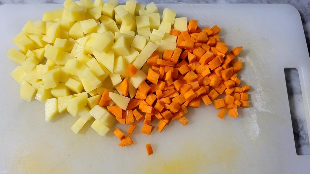 • Mientras tanto corta la patata y la zanahoria en pequeños cubos.