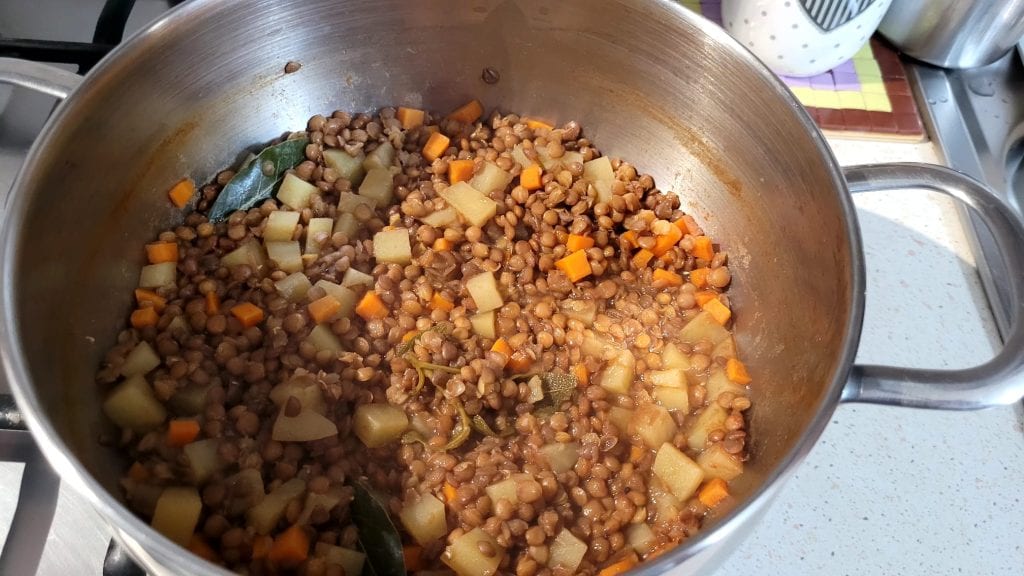 • Añádelos a las lentejas y cocina por unos 15 minutos hasta que las lentejas estén listas.