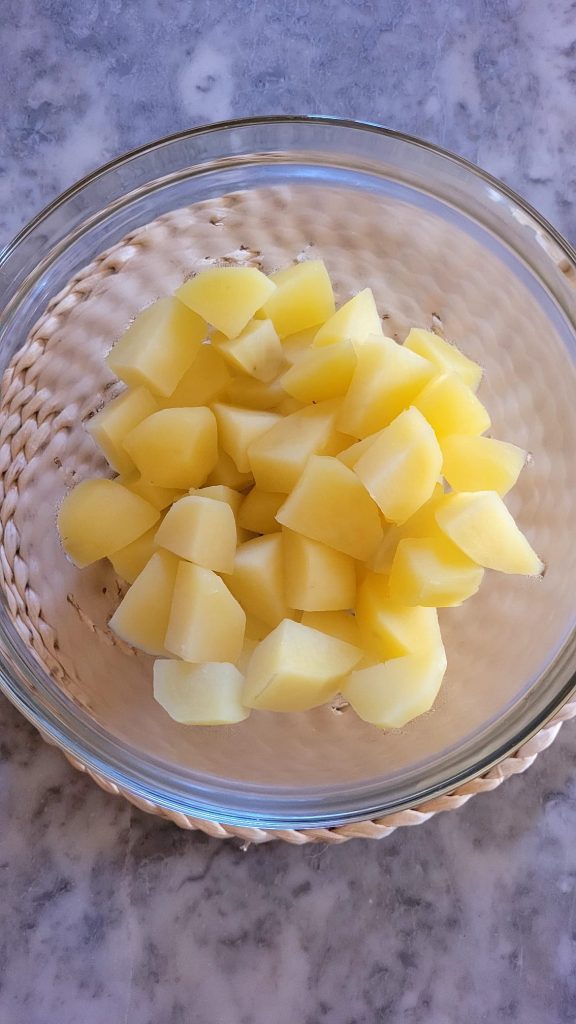 Cocción de las patatas en olla: lavad, pelad y cortad las patatas en trozos. Cocedlas hasta que estén tiernas. Podéis ponerlas a hervir también enteras con la piel y aplastarlas con el aplastapatatas sin pelarlas. Utilizad el método más cómodo para vosotros.