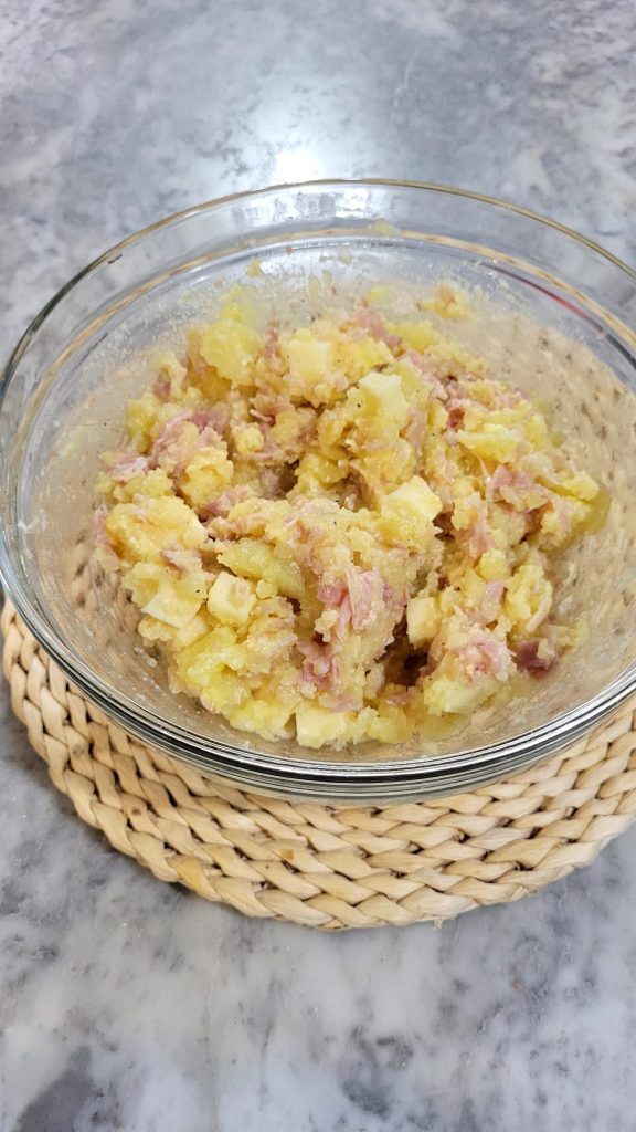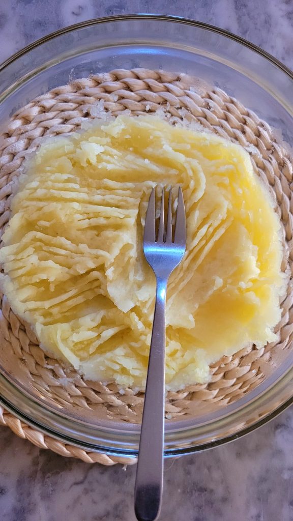 Aplastadlas aún calientes, con la ayuda de un tenedor para obtener un puré homogéneo. Dejadlas a un lado y enfriarse durante unos minutos