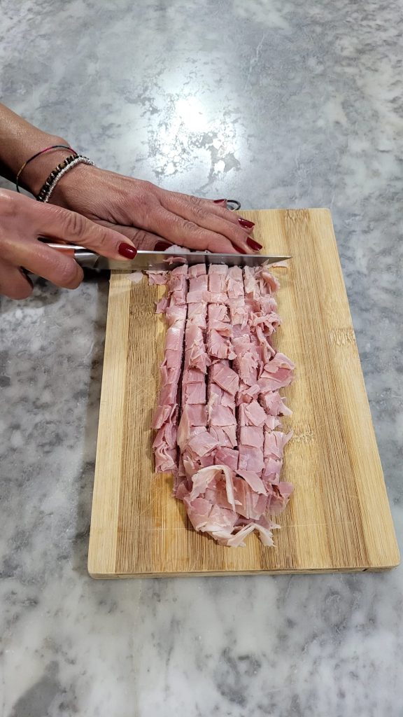 Mientras tanto, dedicaos al relleno de la masa: cortad el jamón cocido primero en tiras luego en dados