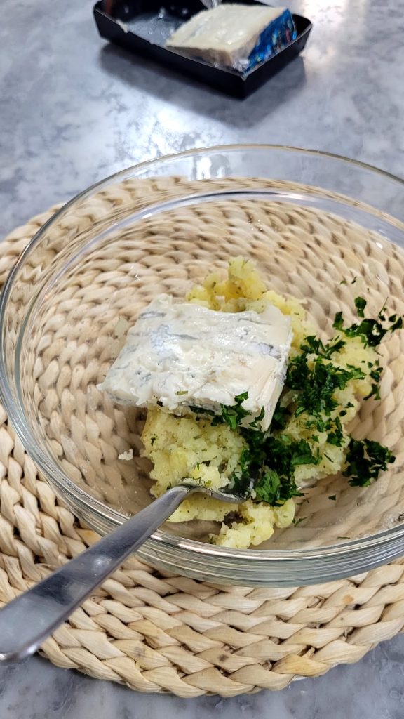 Toma la mezcla de patatas y gorgonzola y llena todas las patatas