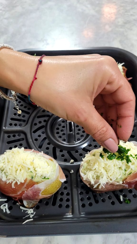 Inicia la cocción air fry a 200° por 6 minutos, el tiempo que el queso se derrita y el speck se vuelva crujiente