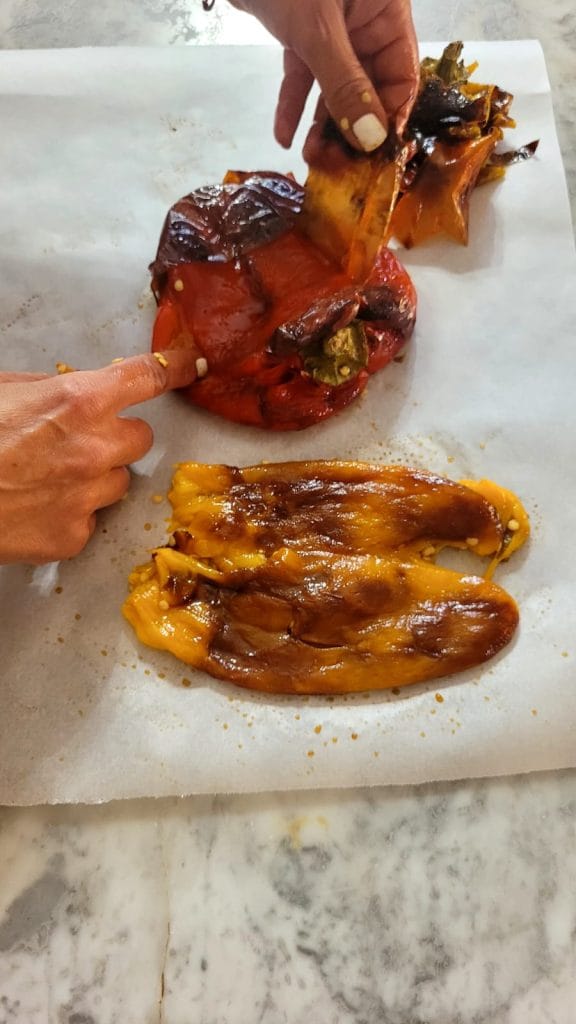 Otra ventaja es que no tenéis que precalentar la freidora de aire, a diferencia del horno que necesita varios minutos para alcanzar la temperatura. Colocáis los pimientos enteros sobre la rejilla del cestillo y comenzáis la cocción de inmediato, ¡un buen ahorro de tiempo y de energía eléctrica! Por último, lo más relevante y asombroso de cocinar los pimientos en la freidora es la facilidad con la que se pelan 😍 os ahorrará mucho tiempo y evitará complicaciones, ¡porque la piel se desprende prácticamente sola! Olvidad el truco de las bolsas de papel y plástico, ¡ya no será necesario! Solo necesitas dejarlos enfriar y la piel se desprende realmente fácilmente, sin volverte loco, como cuando los cocinas en el horno o en el microondas. ¿Entonces, os he convencido? Vamos, seguidme que os enseño los pocos pasos para prepararlos.