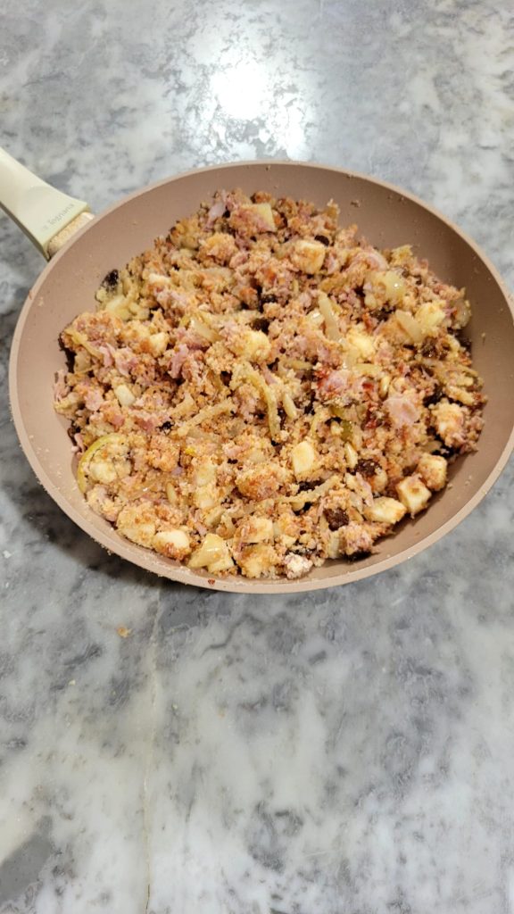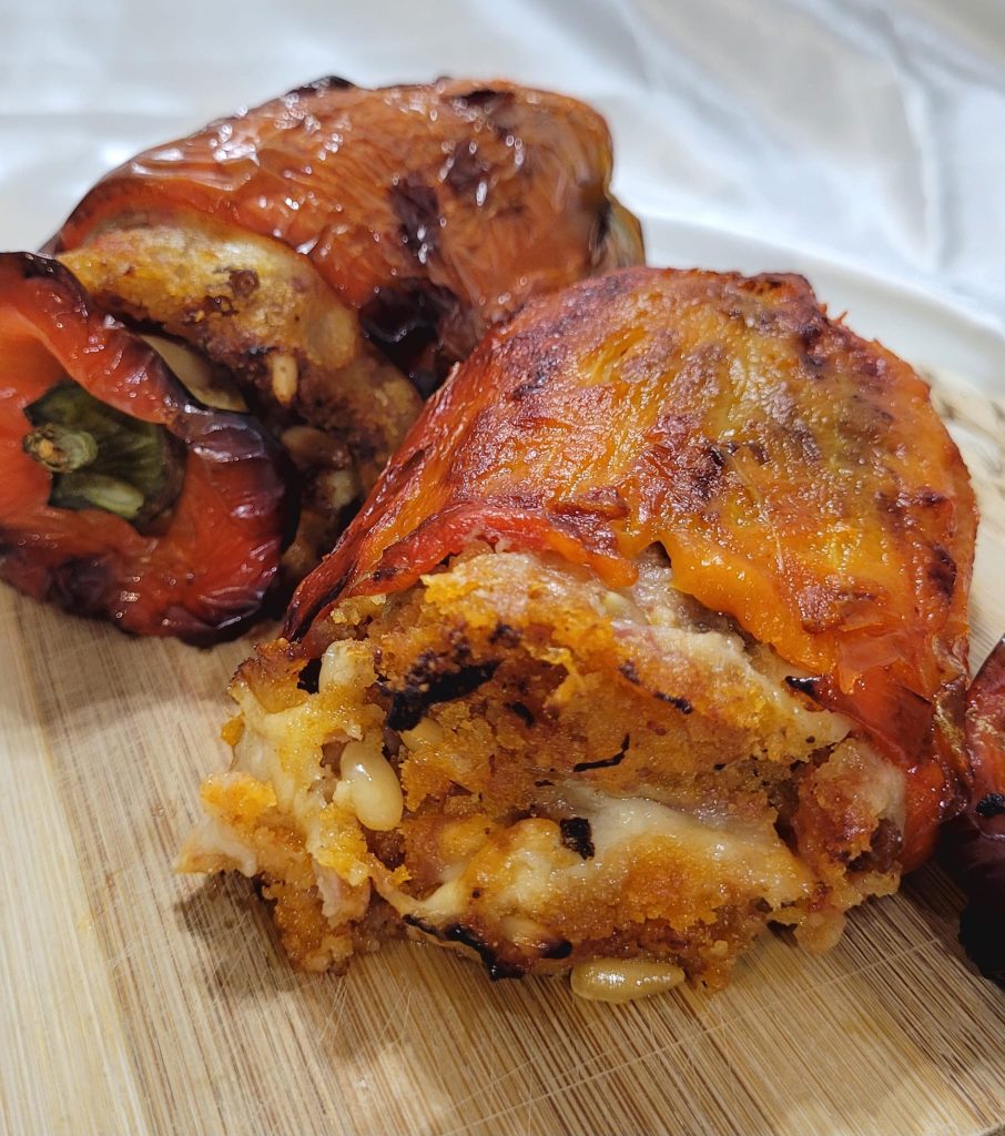 Para prepararlos hacen falta pocos ingredientes genuinos: pimientos grandes y carnosos que encierran una mezcla irresistible de pan rallado, parmesano rallado y queso latteria (uso el que tengo en la nevera) enriquecida por el sabor delicado del jamón cocido. Para hacer todo aún más especial están las pasas y los piñones, que aportan una agradable nota dulce y crujiente, creando un contraste realmente equilibrado.