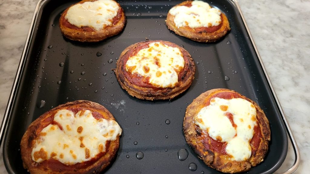 Aquí están las pizzettes listas. Repetid el mismo procedimiento para la siguiente horneada. Al estar la freidora ya caliente, para la segunda hornada podría tomaros algún minuto menos respecto a la primera cocción, ajustaos vosotros