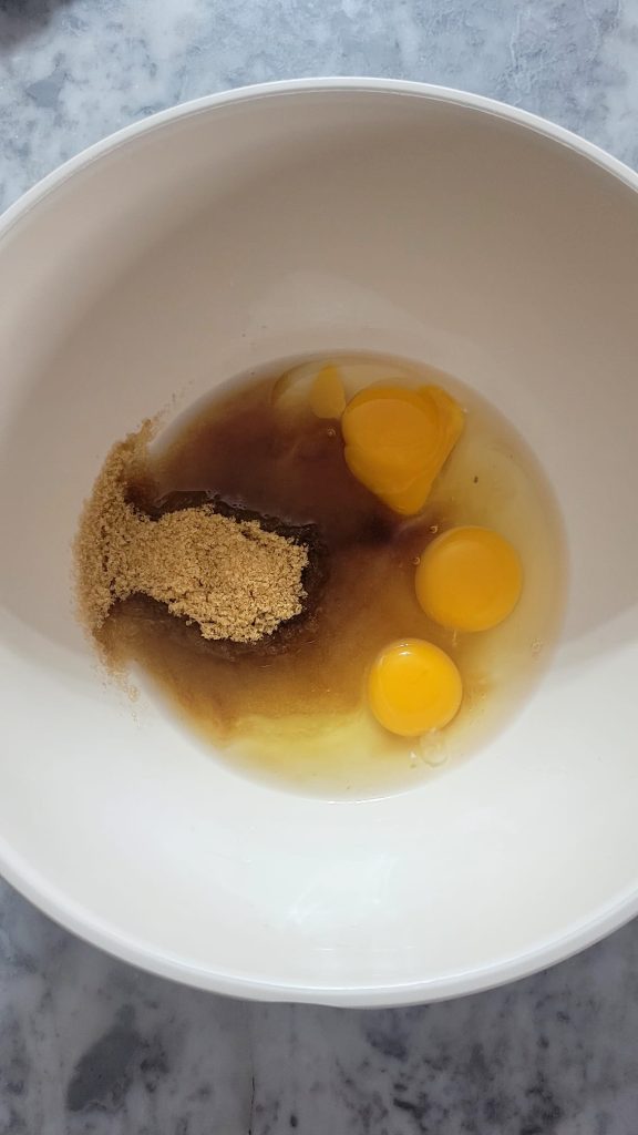 En un bol grande, con la batidora eléctrica, monta los huevos con el azúcar moreno o común durante unos minutos hasta obtener una mezcla clara y espumosa