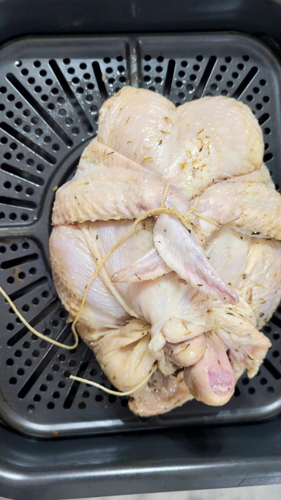 Pasado el reposo, escurre la marinada, ata muslos y alas con dos trozos de hilo y coloca el pollo en la rejilla de la freidora.