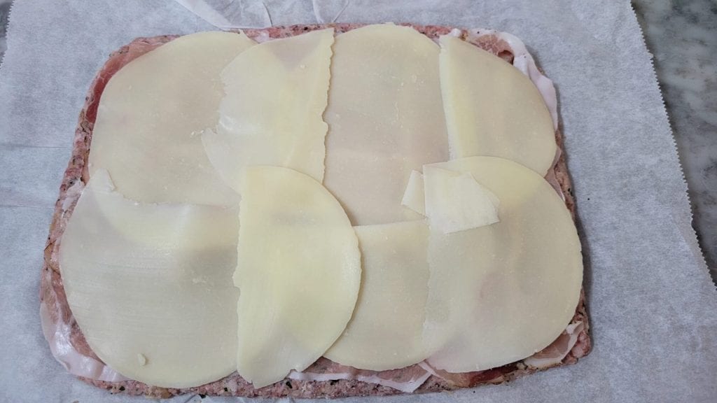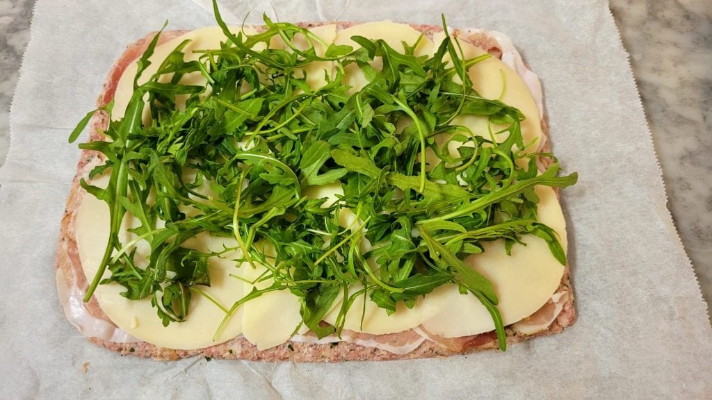 Para el pastel de carne utilicé carne picada mixta de cerdo y vacuno, pan duro que mojé con leche y lo rellené con speck y provola en rodajas y rúcula, pero se pueden variar los ingredientes con otros tipos de embutidos y quesos.
