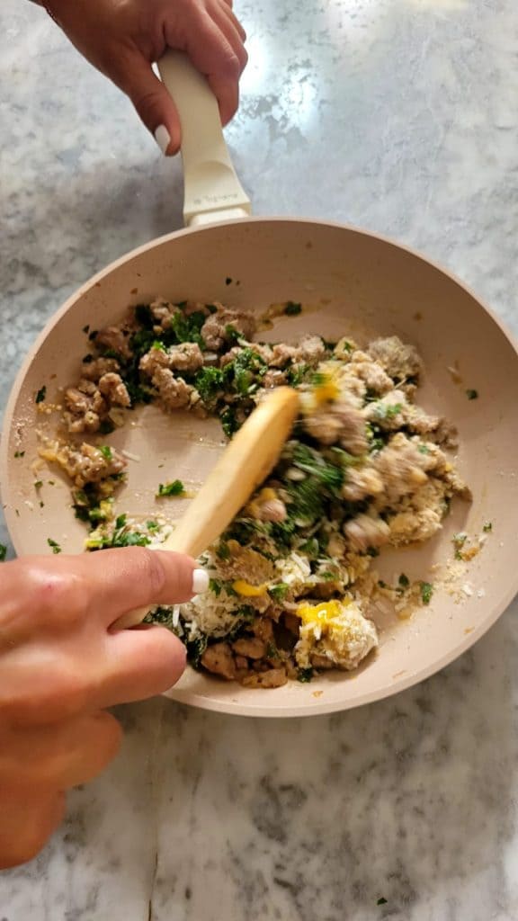 Agregue el pecorino romano rallado, la pimienta, el perejil y una pizca de sal, sin exagerar ya que la salchicha ya es salada y podría resultar un plato demasiado salado
