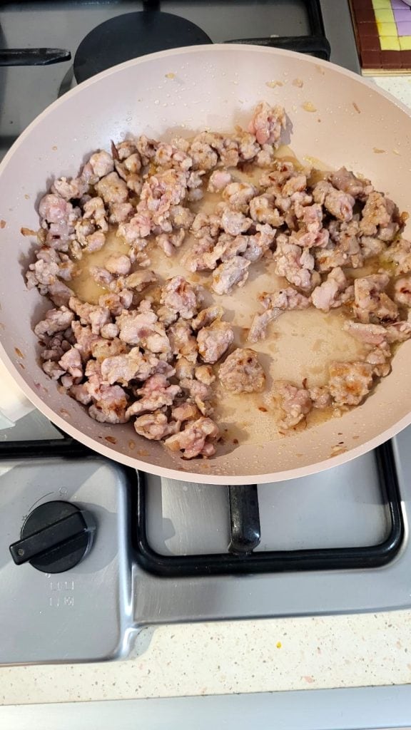 Coloque en el centro el compuesto de salchicha y algunos trozos de pecorino o el queso que haya decidido usar
