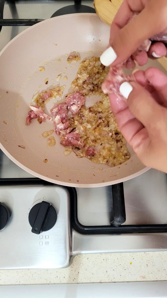 En una sartén sofría la cebolla con un poco de aceite. Una vez pochada, agregue la salchicha sin su tripa y bien desmenuzada