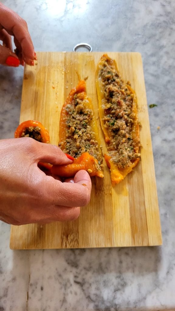 • Distribuye el relleno con una cuchara sobre cada tira de pimiento, luego toma un extremo y enrolla sobre sí misma
