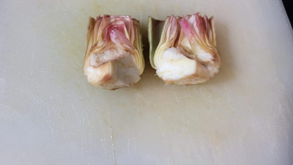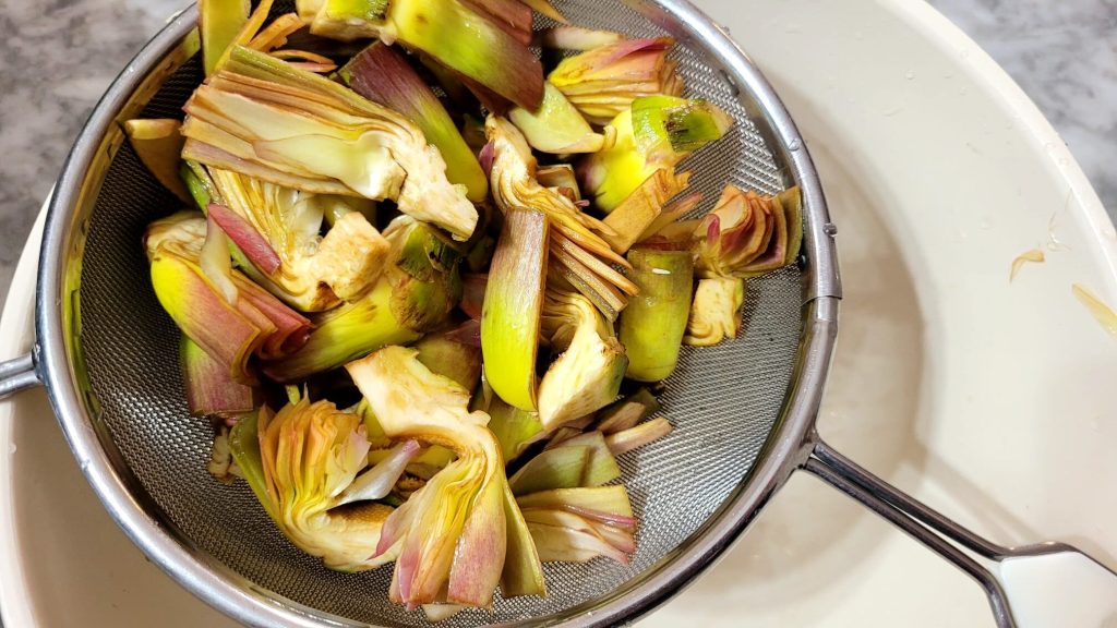 Cocina las alcachofas durante unos 10 minutos a fuego medio, haz la prueba con los dientes de un tenedor, el corazón debe estar suave pero no demasiado