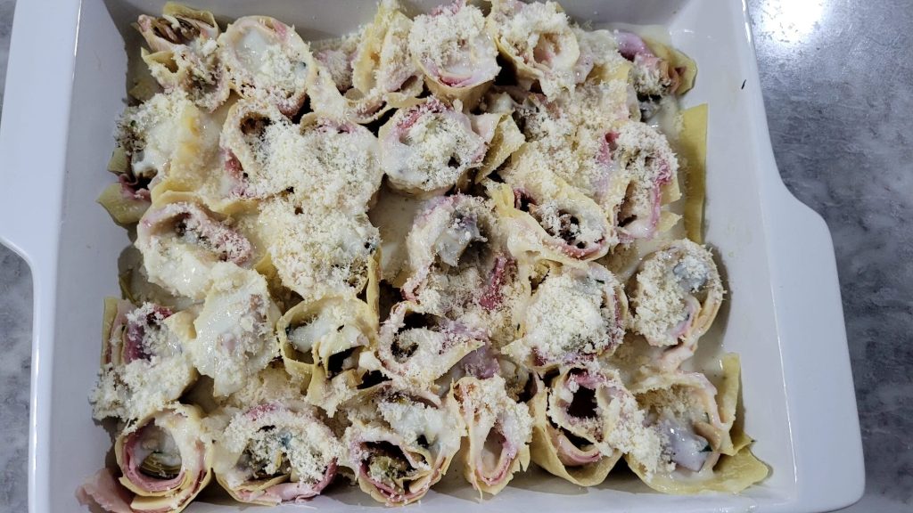 Una vez terminado y llenado la bandeja con los rollitos, cubre con la bechamel y espolvorea con el parmesano.