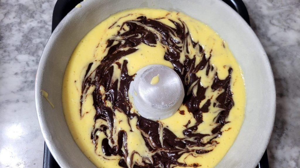 Ahora alterna las dos mezclas dentro del molde: comienza añadiendo una parte de la mezcla clara, añade la de cacao, cubre con el restante de mezcla clara y termina con la de cacao. Pasa por la superficie un palillo o los dientes de un tenedor para crear el efecto veteado
