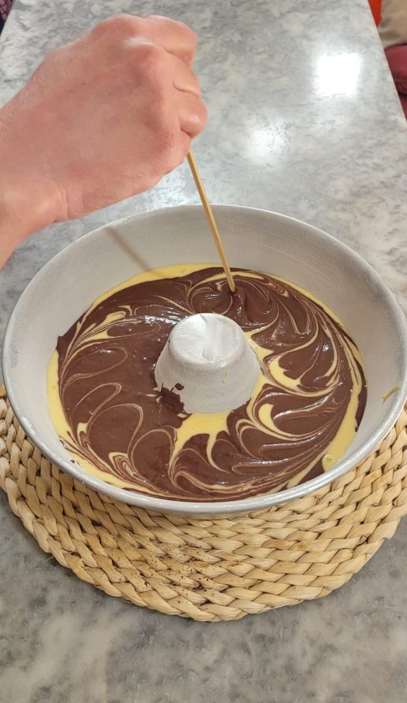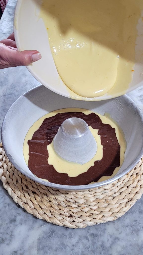 • Continúa alternando las dos mezclas vertiendo la de chocolate sobre la blanca y viceversa hasta agotarlas completamente