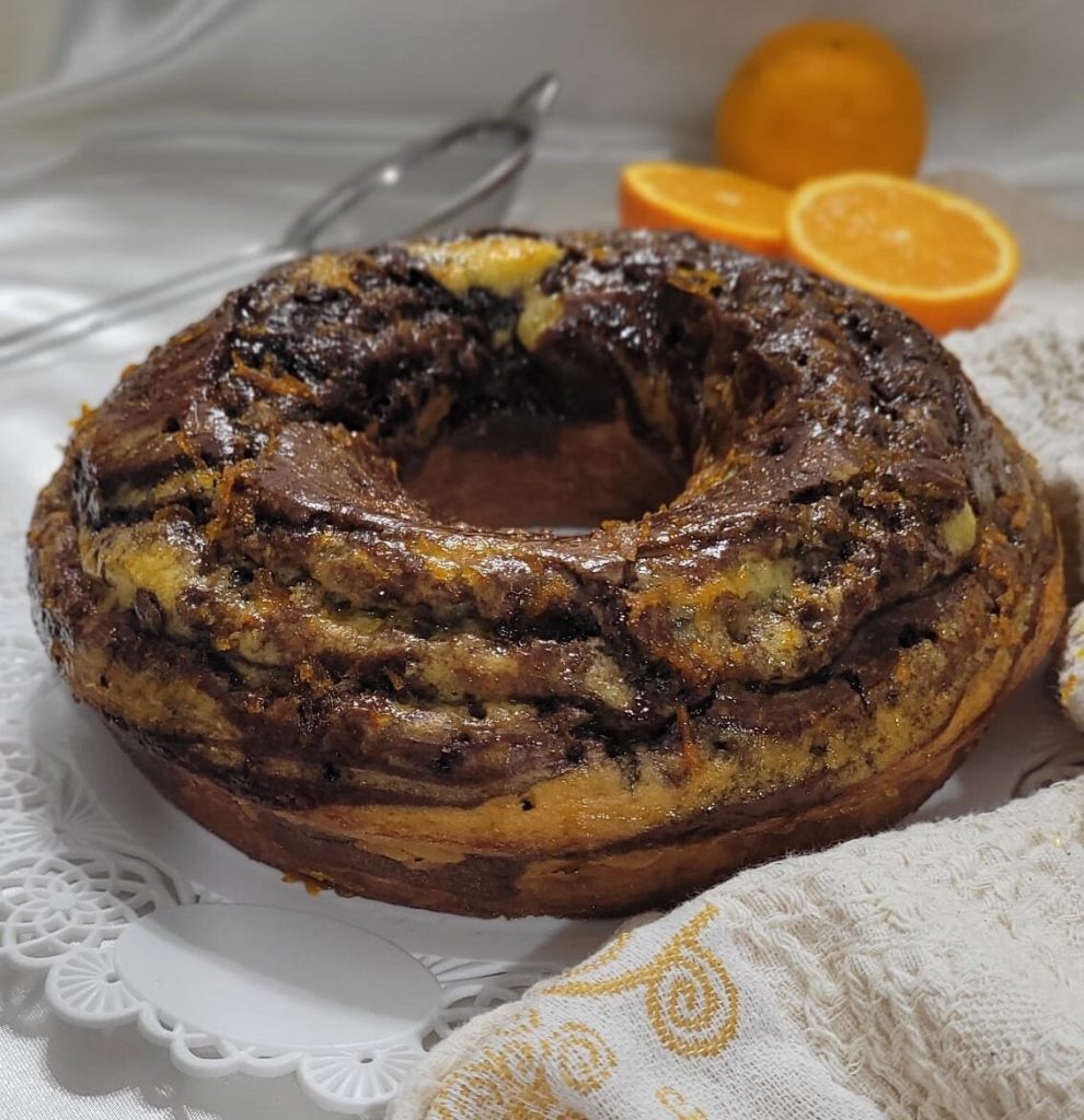La Rosca de Naranja y Cacao se conserva suave por varios días cubierta con una campana o film alimentario