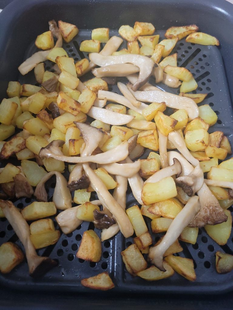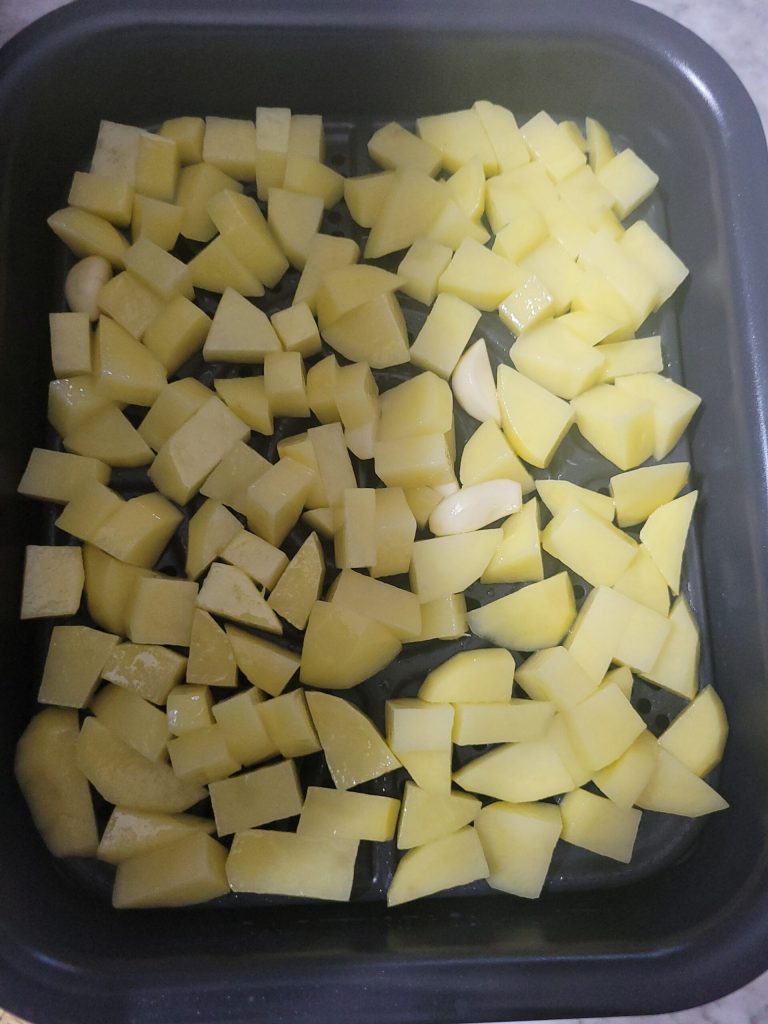 • Después de lavar y pelar las patatas, enjuagarlas bajo agua corriente, secarlas con un paño de papel, cortarlas en trozos y transferirlas a un bol y sazonarlas con algunos puffs de aceite y los dientes de ajo, mezclar y pasarlas directamente sobre la parrilla de la cesta de la freidora o en la bandeja perforada si tienes una freidora tipo horno. Cocer air fry 200° x 15 minutos.