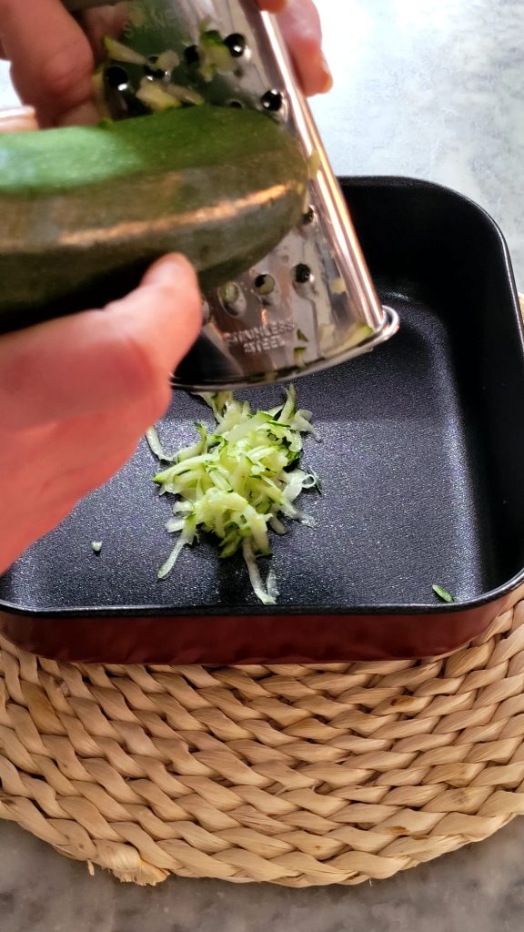Lava el calabacín, sécalo bien, corta los extremos y rállalo directamente en la fuente antiadherente que vas a usar para la cocción del pastel
