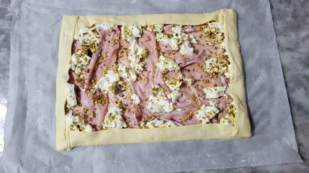 Luego, si te gusta hacer que la corteza sea más crujiente, puedes cubrirla con semillas de sésamo, como hice yo, o con semillas de amapola. Para la receta que te propongo, he utilizado una masa de hojaldre rectangular ya lista, así que se necesitan realmente pocos minutos para preparar un strudel delicioso. Además de los strudels con masa de hojaldre se pueden hacer muchas cosas como la Tarta salada con verduras y stracchino en freidora de aire o el Rollo de patatas cremosas en crosta. Ahora, sin embargo, veamos cómo se prepara este delicioso strudel salado stracchino mortadella y granillo de pistachos