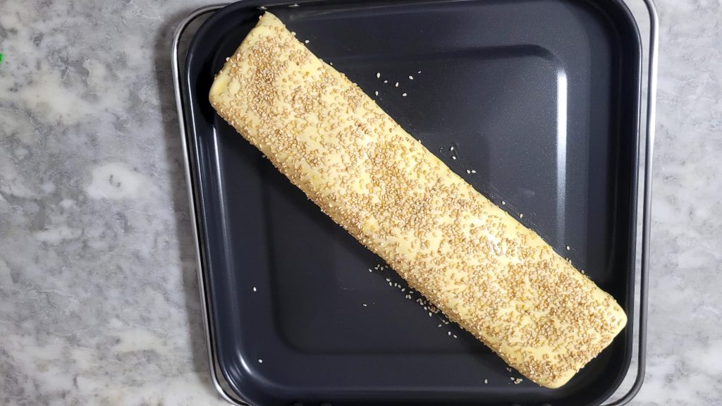 Con la ayuda del papel de horno, enrolla la masa por el lado largo y cierra en forma de salchicha. Transfiere el strudel a la bandeja con la parte de cierre hacia abajo y si puedes, elimina el papel de horno, de lo contrario elimínalo a mitad de cocción para permitir que se cocine también por debajo. Pincela la superficie con un huevo batido y espolvoréala con las semillas de sésamo