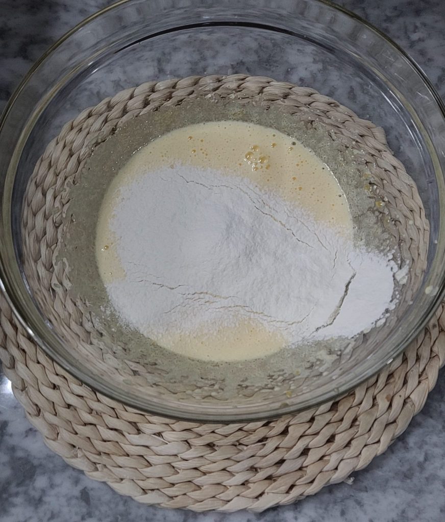 Verted la leche en el bol con los huevos, montad con el azúcar y mezclad con las varillas manuales