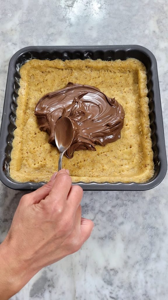 Engrasa y enharina el molde para tartas e inserta la masa quebrada recortando y alineando los bordes. Pincha la base con los dientes del tenedor y distribuye la nutella nivelándola con el dorso de la cuchara