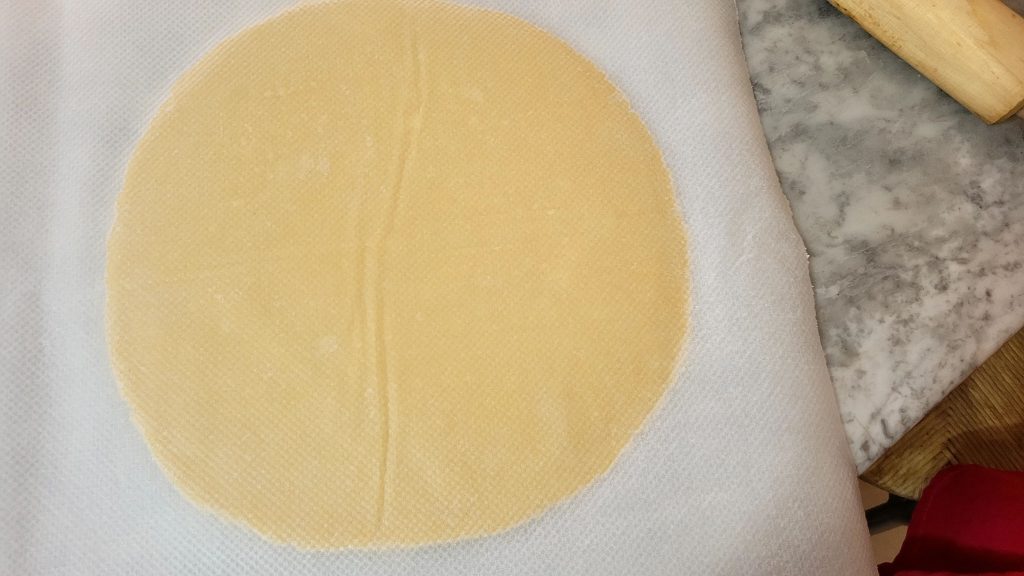 • Con ayuda de un rodillo, en una superficie de trabajo, extender la masa quebrada entre 2 hojas de papel de horno espolvoreadas con harina.