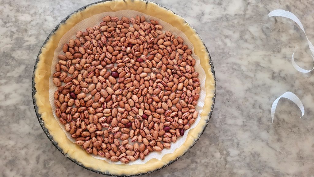 • Después del tiempo de reposo, cubrir la masa quebrada con un disco de papel de horno recortado e insertarlo en el centro, cubrirlo con frijoles secos.