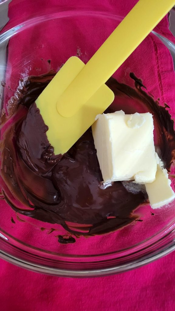• Una vez derretido, retira el cuenco del fuego, añade la mantequilla y con una espátula mezcla bien. Deja aparte y enfría antes de agregarlo a la masa