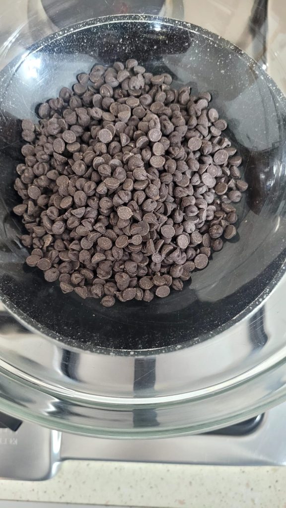 • Derrite el chocolate al baño maría: coloca un poco de agua en la cacerola, inserta un cuenco con el chocolate troceado en su interior (yo he usado gotas). Utiliza un cuenco grande para que el agua no entre en contacto con el fondo del cuenco, el chocolate deberá derretirse lentamente con el calor. Remueve a menudo