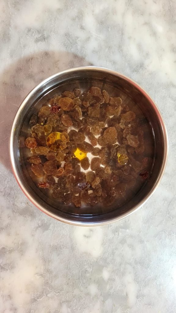 • Rehidrata las pasas en un bol con agua tibia y unas gotas de agua de azahar, durante 10 minutos
