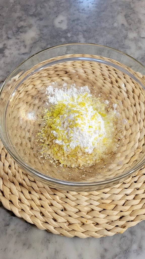 • En la picadora, pica las almendras y únelas en un bol con el azúcar glas, el resto de la ralladura de limón, 1 pizca de sal y la mantequilla derretida restante