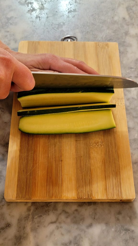 Comenzad preparando los calabacines. Después de lavarlos y secarlos, en una tabla de cortar o en una superficie de trabajo, eliminad los dos extremos y cortad los calabacines a un grosor de más de medio centímetro.