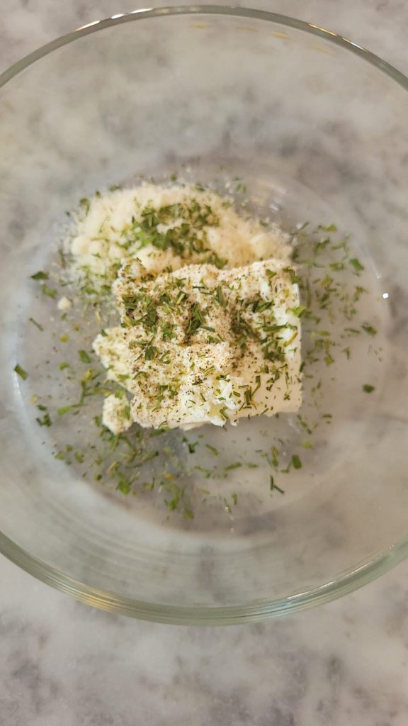 Mientras los calabacines se enfrían un poco, ocupémonos del relleno. En un bol, mezclad la robiola con 20 g de Grana Padano, el cebollino, una pizca de sal y la pimienta.