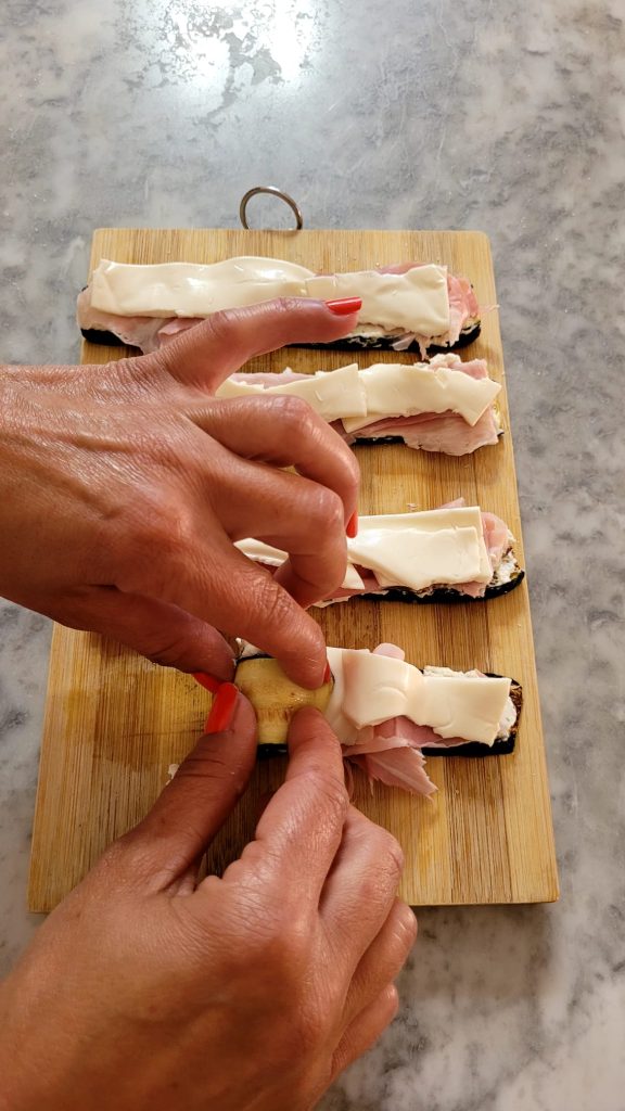 Colocad también una tira de loncha de queso en cada rodaja. Tomad el extremo del calabacín y enrolladlo sobre sí mismo.