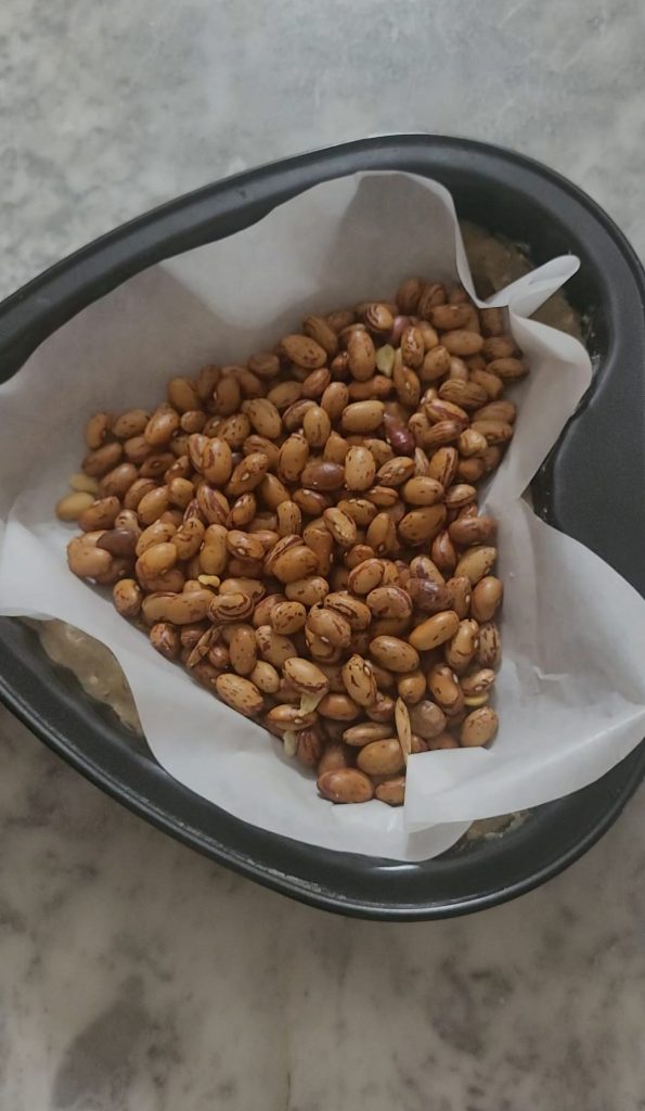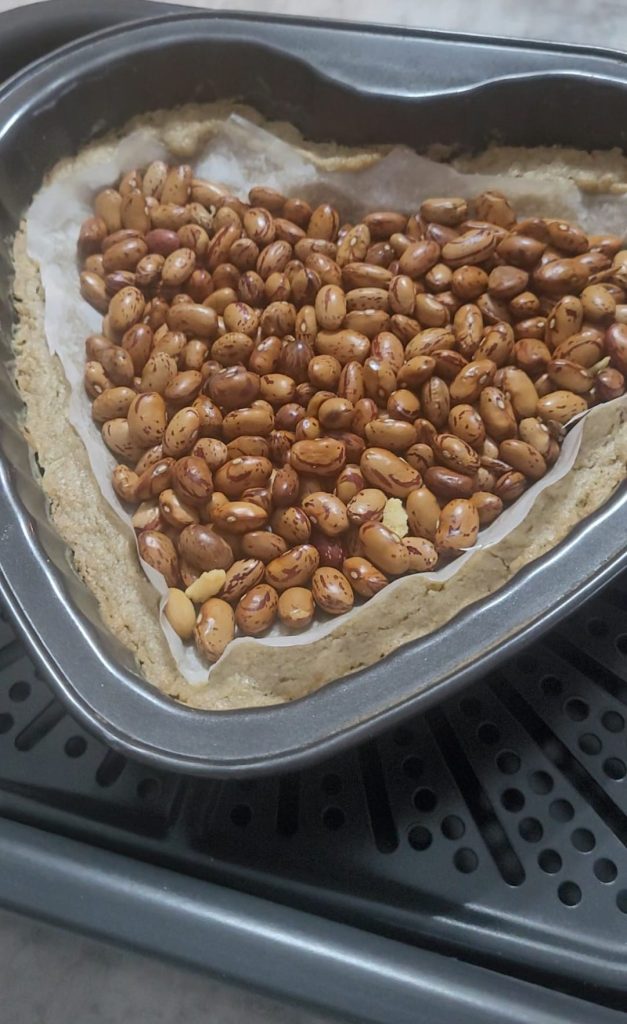 Terminada la primera cocción, retira el molde, saca los frijoles, el papel de horno y coloca nuevamente la tarta en la freidora.