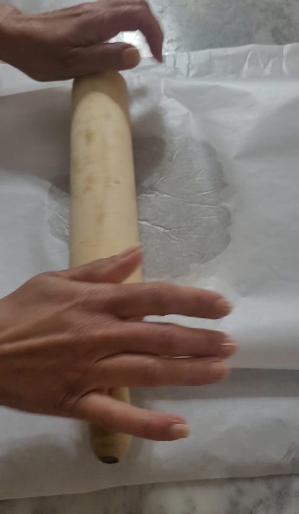 Terminado el tiempo de reposo de la masa quebrada, retira el papel film y extiéndela entre dos hojas de papel de horno ligeramente enharinadas.