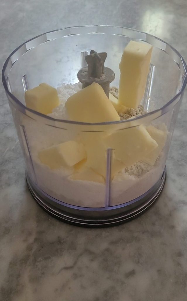 En la batidora, en una batidora de pie o si prefieres a mano, mezcla la harina, la mantequilla fría y el azúcar glas hasta obtener una mezcla arenosa.
