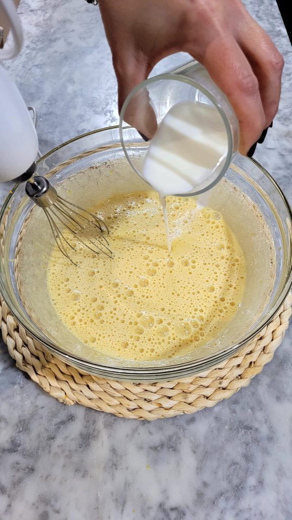 Los huevos y la leche deben estar a temperatura ambiente y la mantequilla derretida no debe añadirse caliente, así que preparadla con antelación y dejad que se temple.