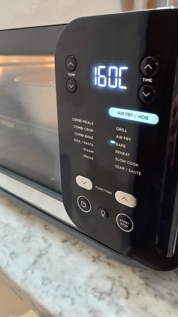 • Precalentad la freidora a 160º por 2/3 minutos y coced en programa de horneado o air fry a 160º por 35 minutos. Haced la prueba del palillo, si en el centro está cruda, proseguid por 2/3 minutos