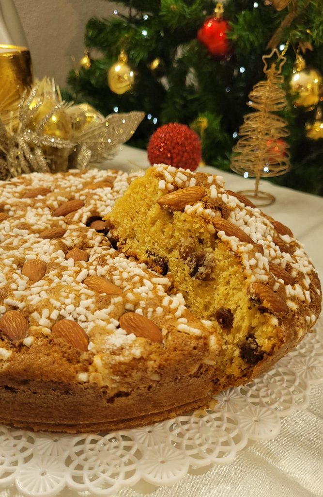 La Tarta Panettone en Freidora de Aire, es suave y huele a cítricos, enriquecida con pasas y frutas confitadas (yo no las puse), recuerda los sabores de la tradición. Mi versión es con almendras y azúcar granulado que, además de hacerla aún más deliciosa, le dan un aspecto similar a la versión con almendras que a mi familia le gusta mucho.