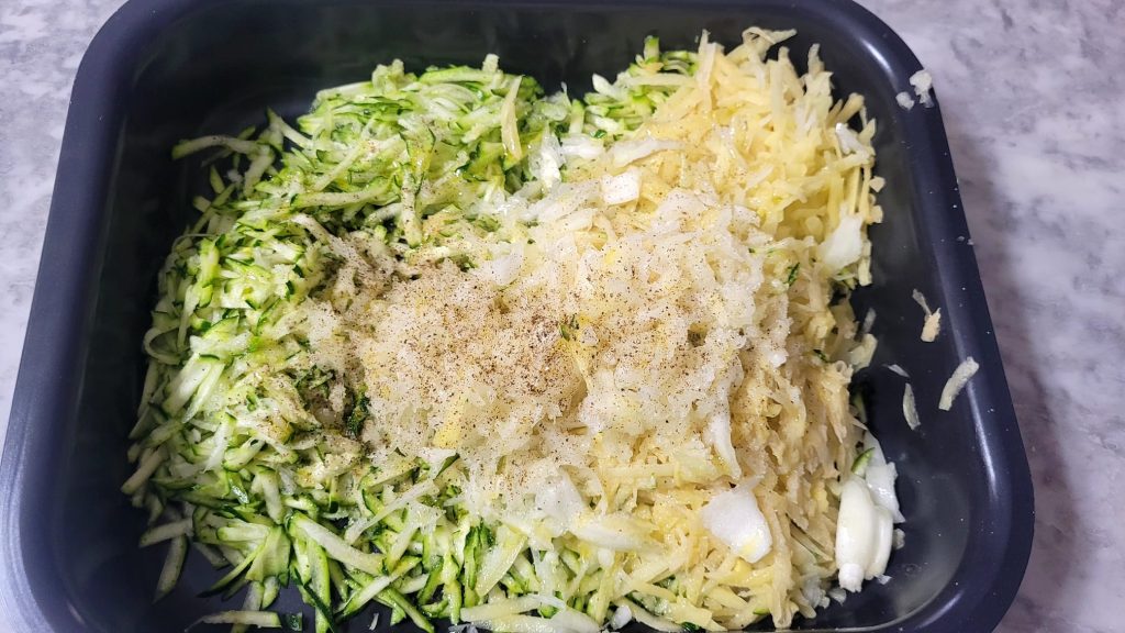 Corta los extremos de los calabacines, lava y pela las patatas, pela la cebolla. Con el rallador de agujeros grandes, ralla todo directamente en el molde donde vas a cocinar las verduras. Condimenta con un chorrito de aceite de oliva, sal, pimienta y mezcla
