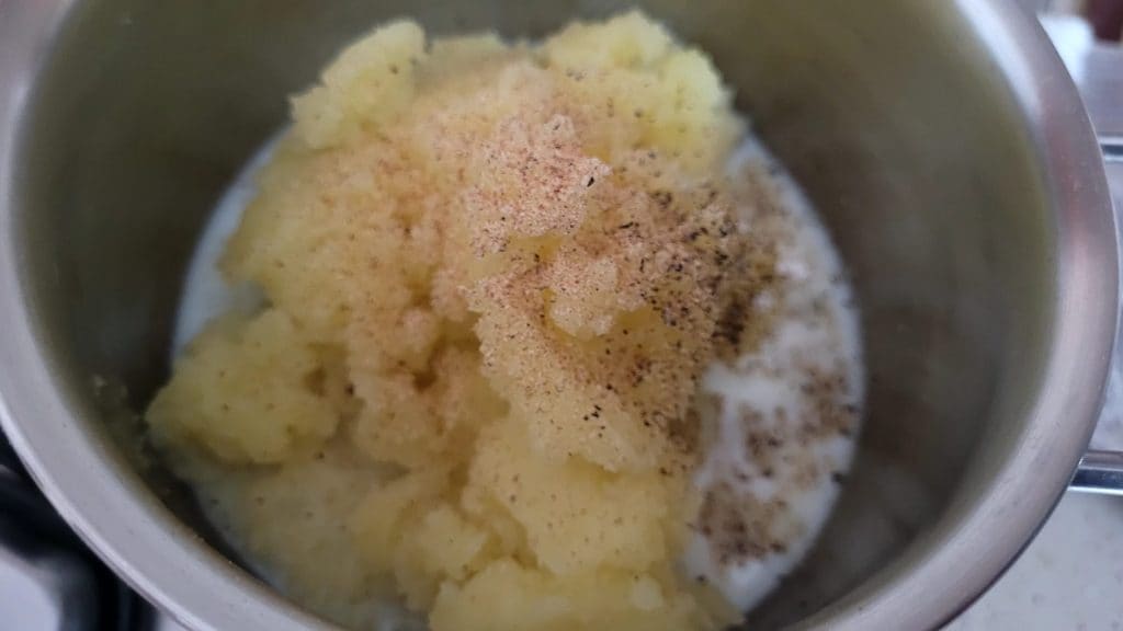 • Vierte en una olla la leche, añade las patatas aplastadas, sal, pimienta y una generosa ralladura de nuez moscada y cocina el puré hasta que las patatas hayan absorbido toda la leche, mezclando con un batidor.