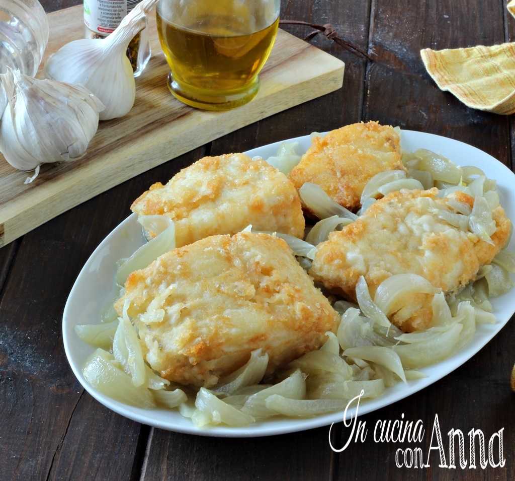 El Bacalao con cebollas es un segundo plato de pescado rústico y sabroso, un plato muy sencillo de preparar, pero riquísimo. La combinación de cebollas y bacalao es perfecta y si quieres puedes añadir también aceitunas negras, yo he preferido dejar el plato simple con el bacalao suave y crujiente, las cebollas caramelizadas simples, pero puedes añadirlas para un toque extra durante la cocción de las cebollas.