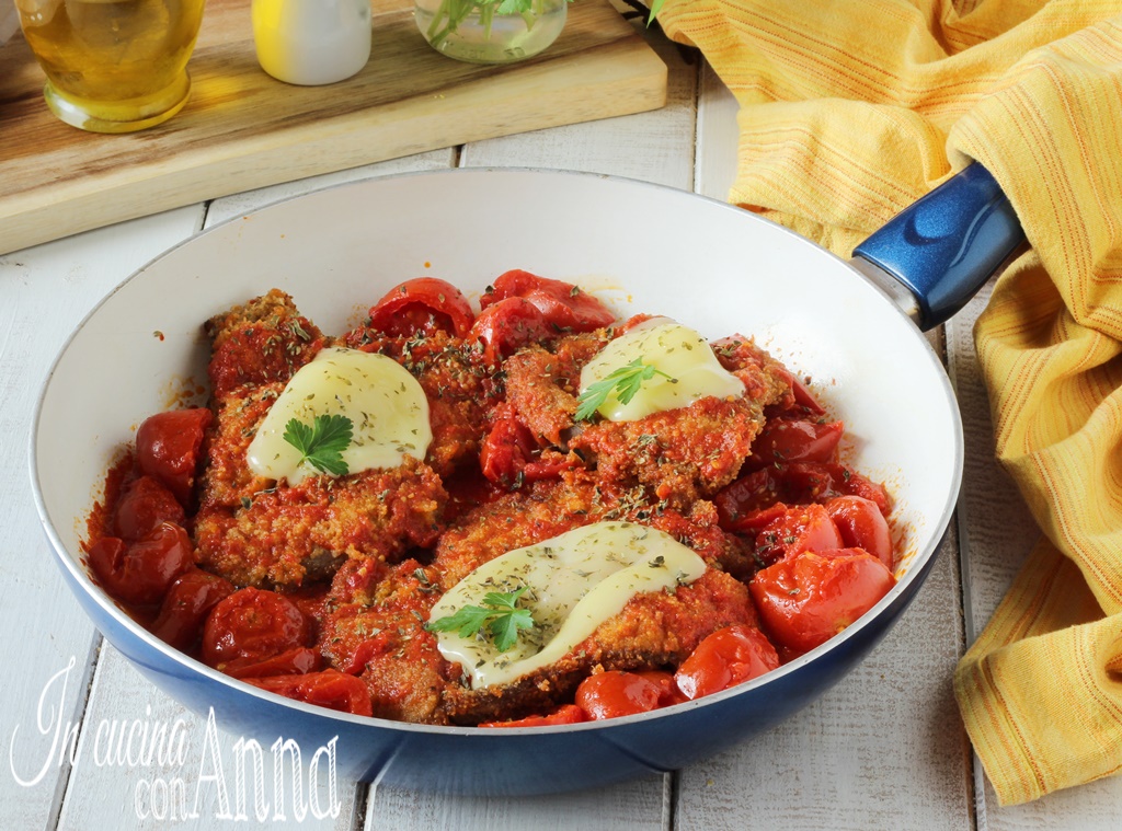Tan pronto como las cotolette estén cocidas, trasladad la sartén con el tomate al fuego medio y colocad las cotolette en los tomates, cocinad por unos minutos más, luego dad la vuelta a las cotolette por el otro lado, dejad cocinar unos minutos más.