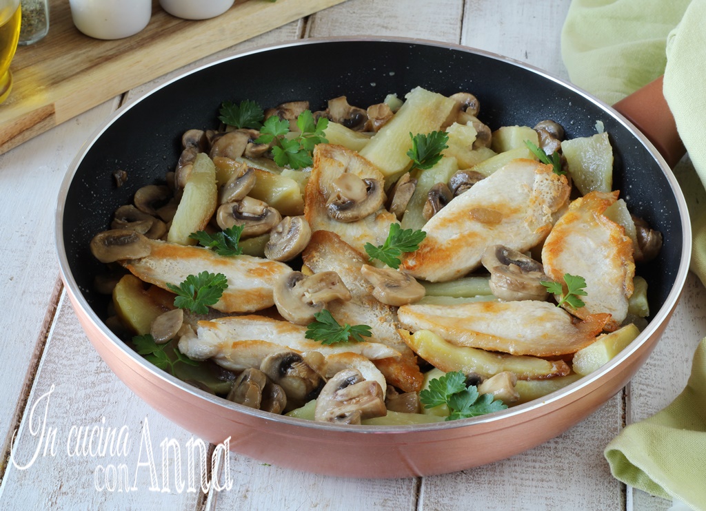 • Coloca la sartén donde has cocinado el pollo de nuevo al fuego, añade las patatas, los champiñones y la cebolla, cubre con una tapa y cocina por 10 minutos a fuego medio-bajo agitándola o mezclando suavemente de vez en cuando (para no desmenuzar las patatas).