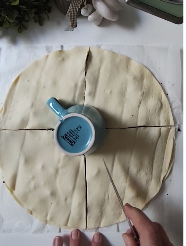 Con un cuchillo afilado, cortar el hojaldre en 4 deteniéndose en la taza, como en la foto.