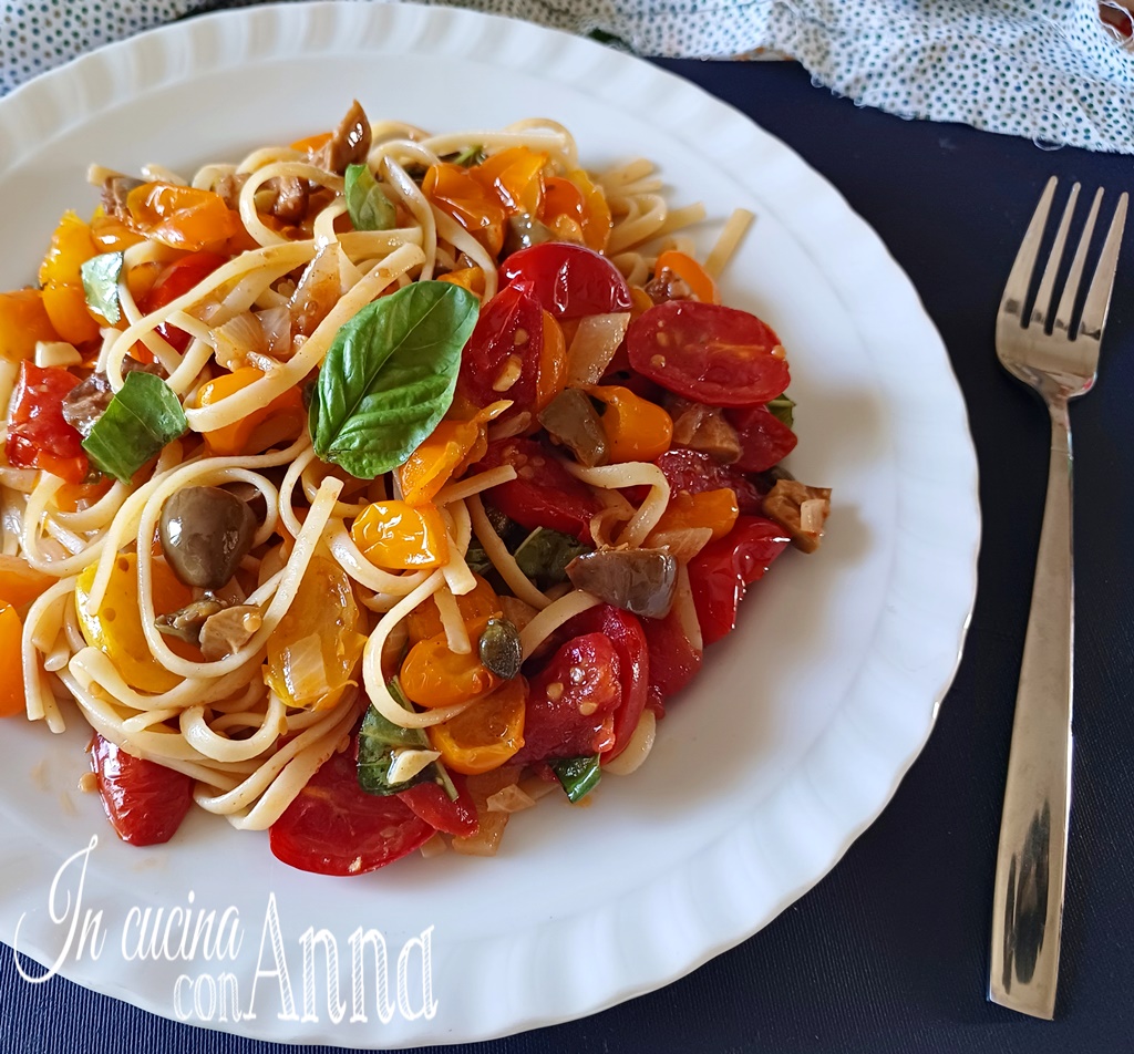 Las Linguine con tomatitos, aceitunas y alcaparras son un plato muy sencillo y rápido de preparar, en el que se necesitan poquísimos ingredientes, pero combinados juntos crean un plato especial de sabor único. Un plato perfecto para toda la familia, pero también si tienes amigos a cenar, pruébalos y en su simplicidad te conquistarán al primer bocado.